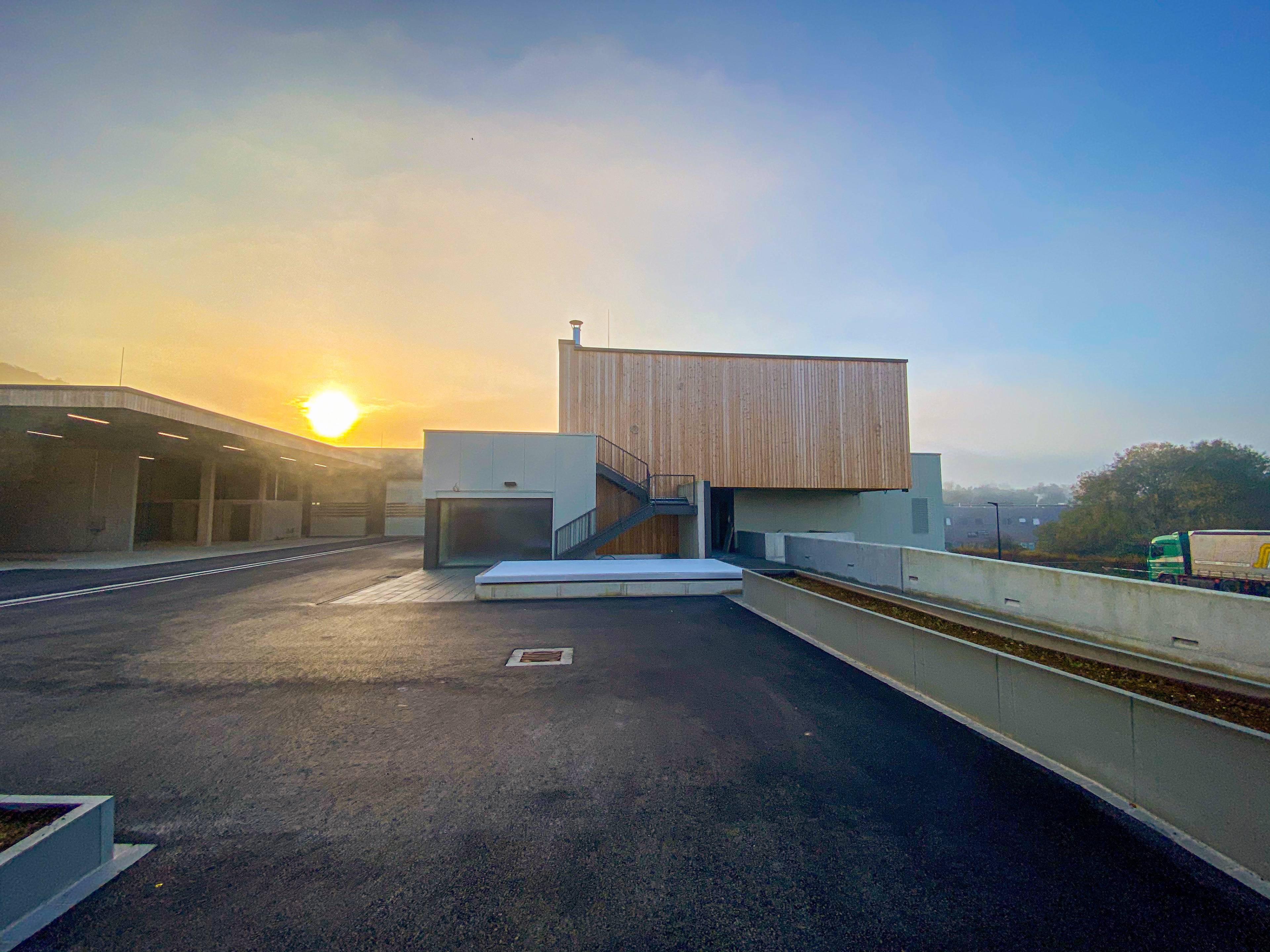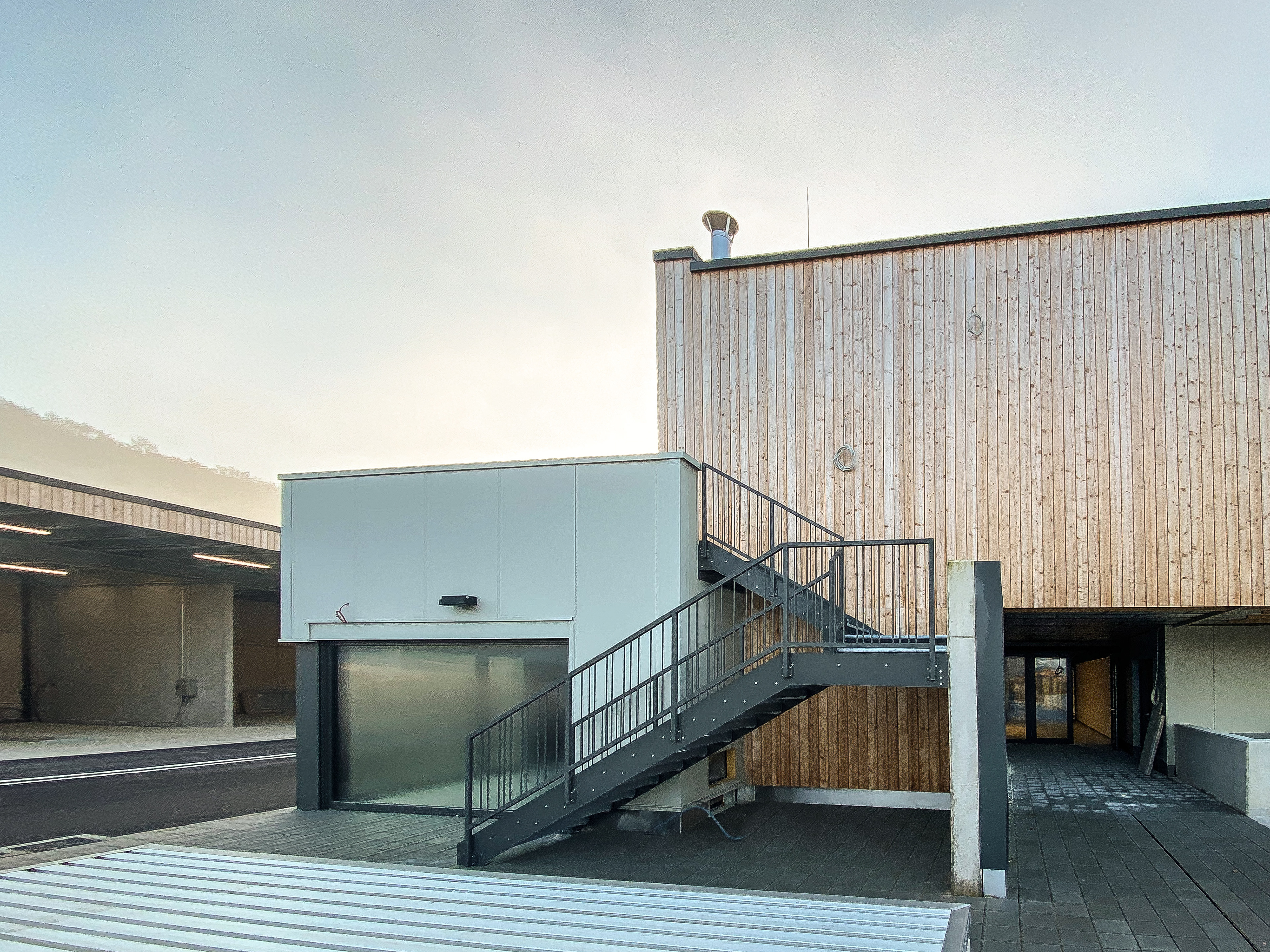 Matériaux utilisés : Bardage bois, panneaux composites, toiture végétalisées, dalles béton-gazon