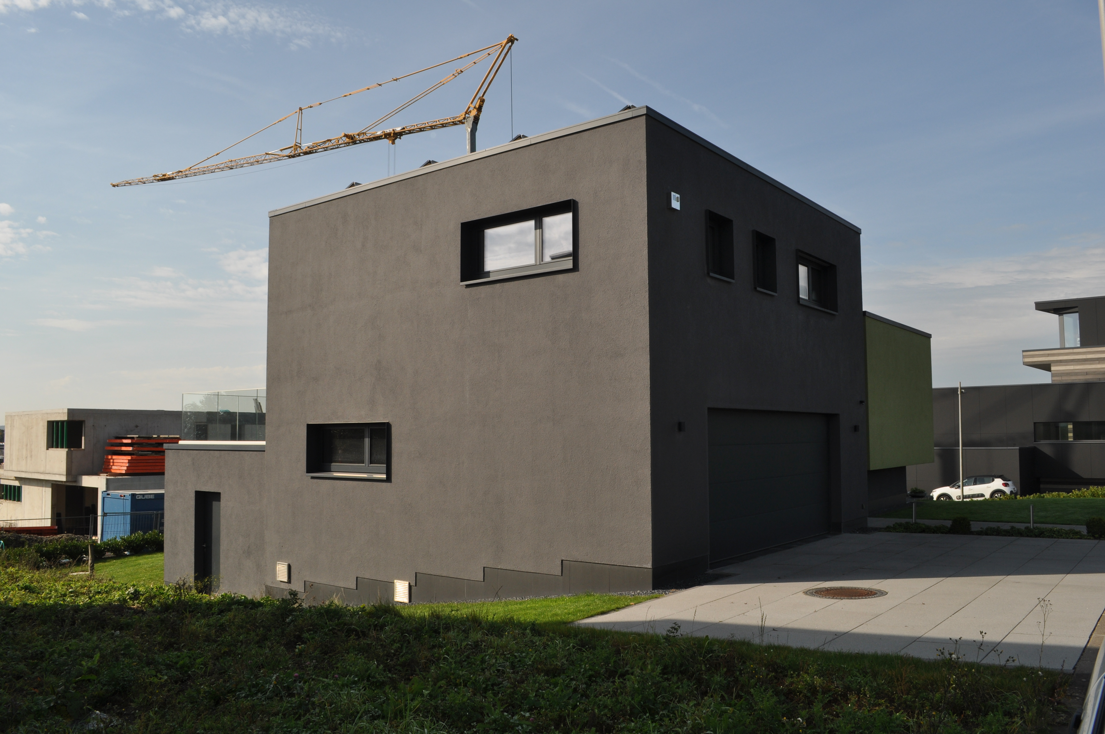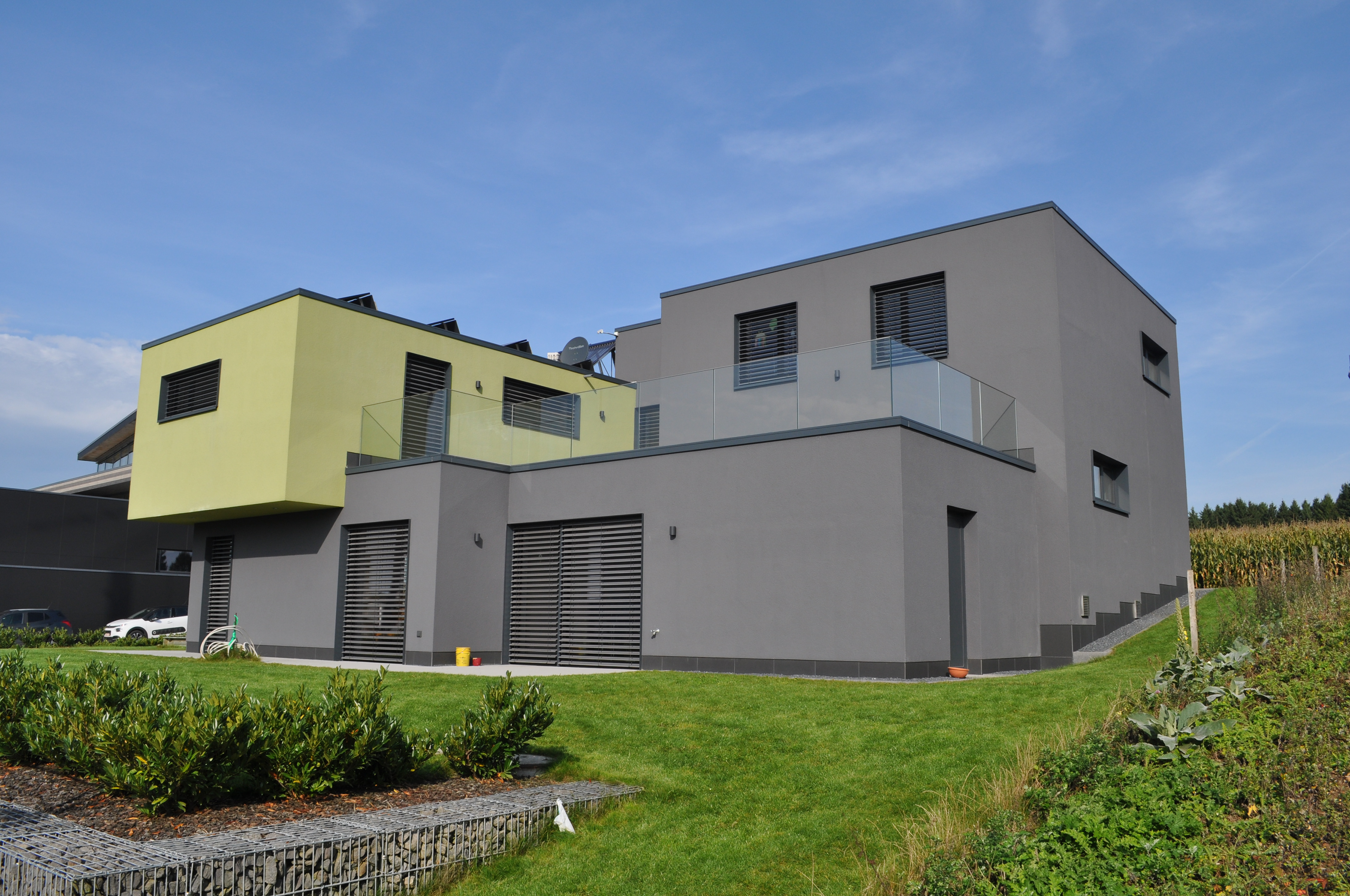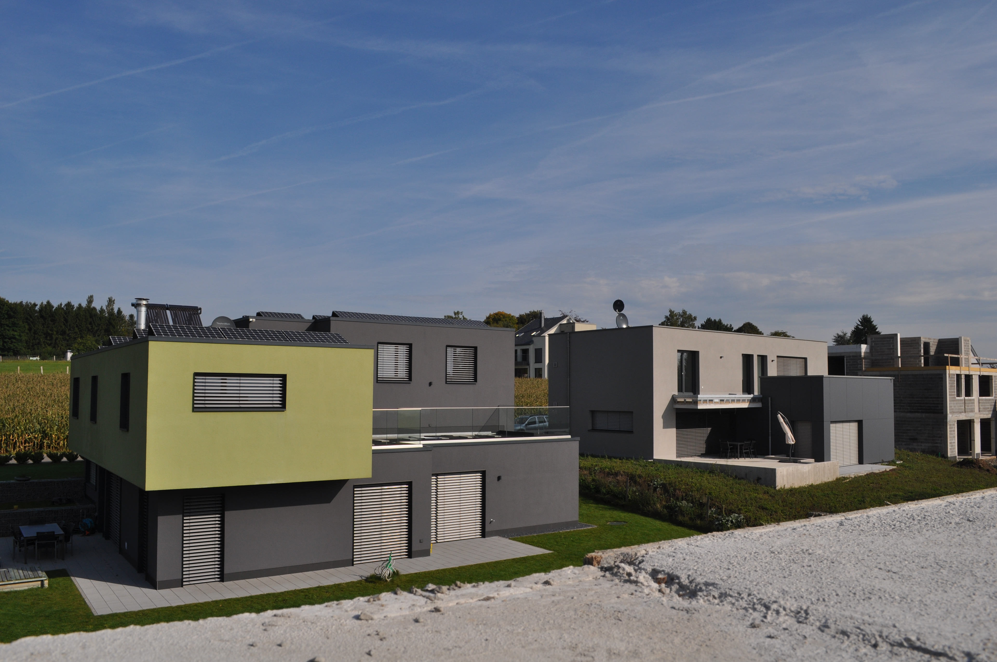Les toitures plates sont exploitées comme terrasse ou comme support pour la technique : panneaux solaires, panneaux photovoltaïques. Le chauffage sol est alimenté par une pompe à chaleur terre/eau. La ventilation double flux avec puits canadien veille à la bonne atmosphère générale. Des stores extérieurs empêchent la surchauffe du bâtiment. Toutes les techniques sont gérées par une installation domotique.
