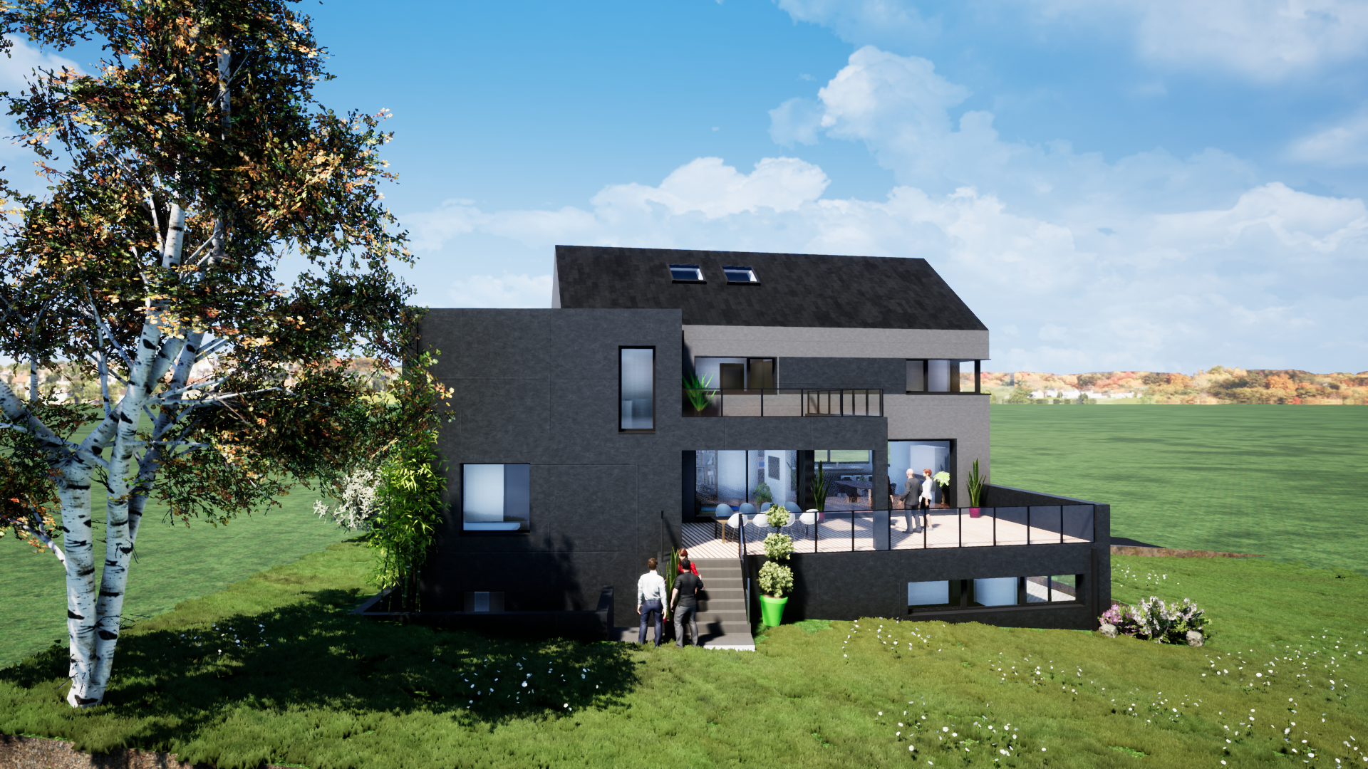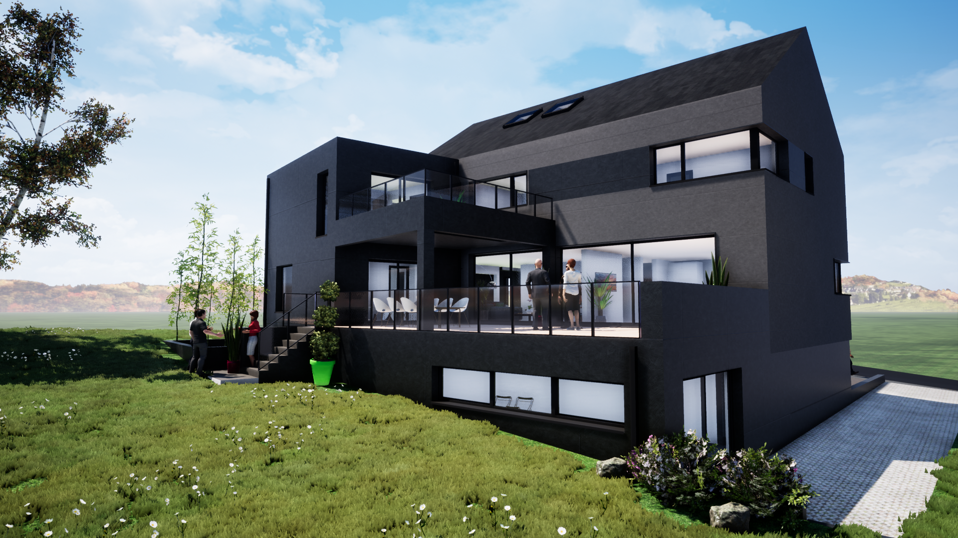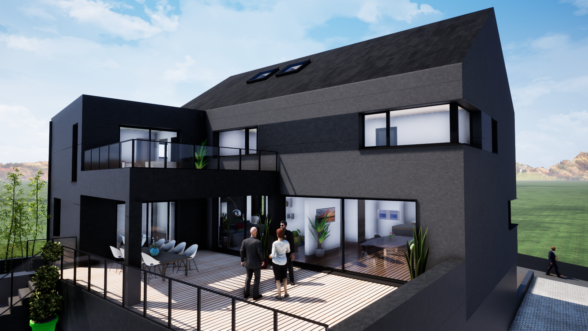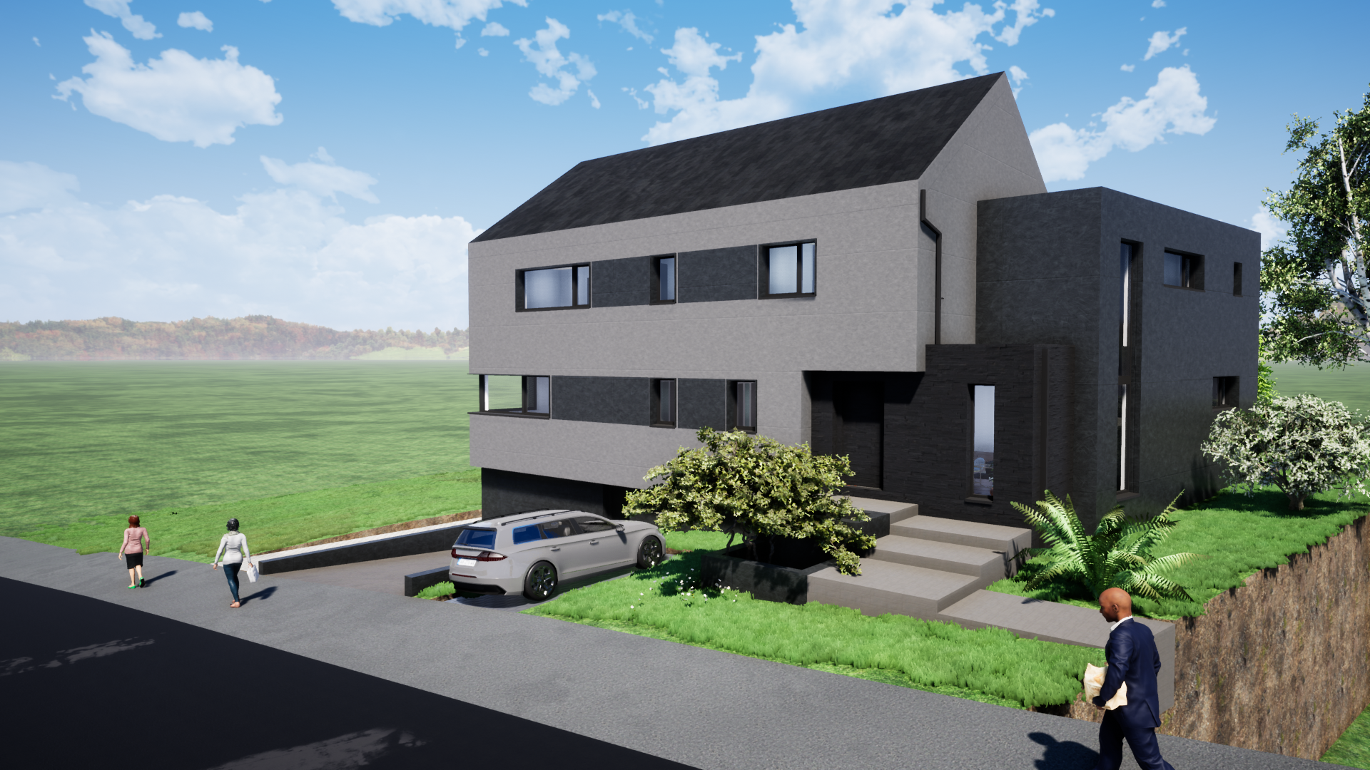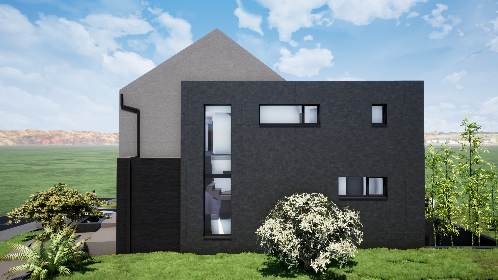 Matériaux utilisés : Crépi, panneaux TRESPA, ardoises, Blocs STEPOC