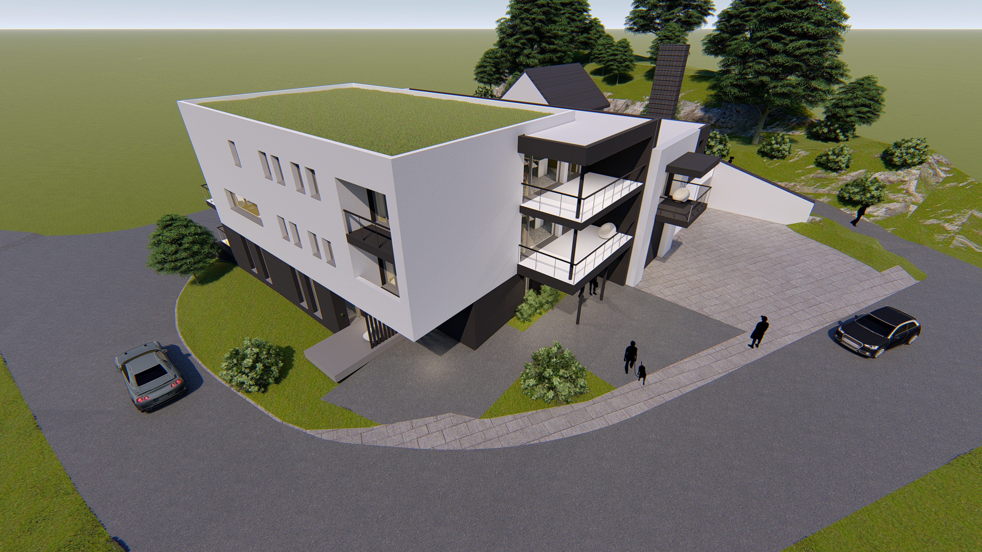 Matériaux utilisés : Bardage bois, crépi, panneaux composites, toiture végétalisées, dalles béton-gazon