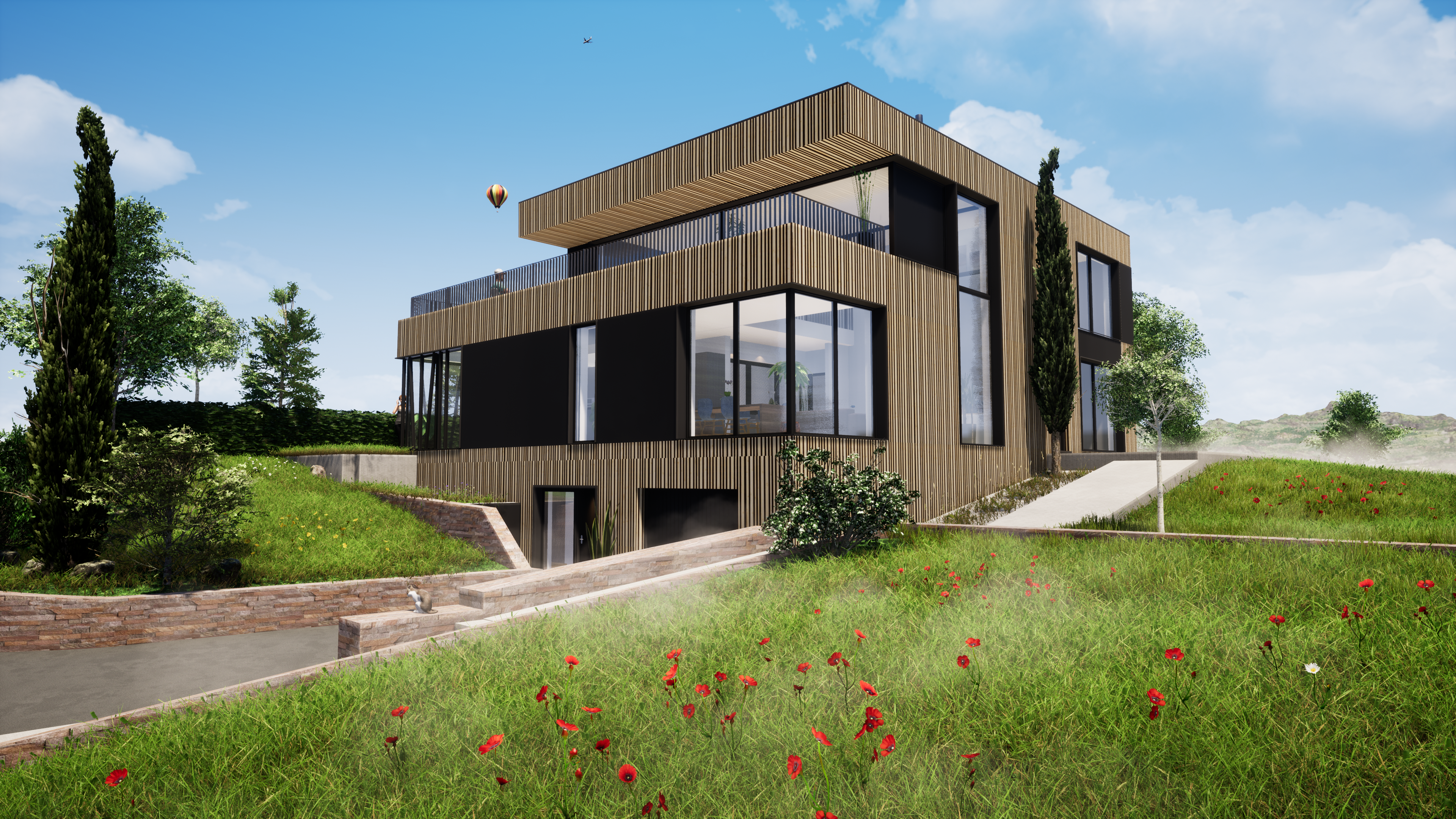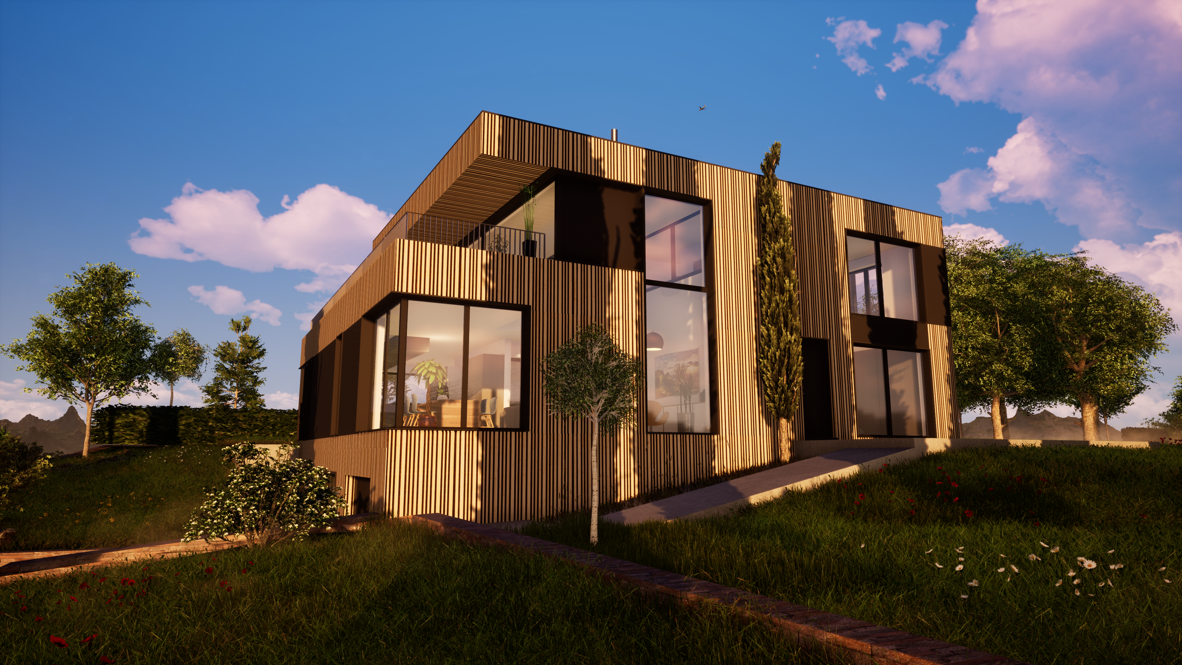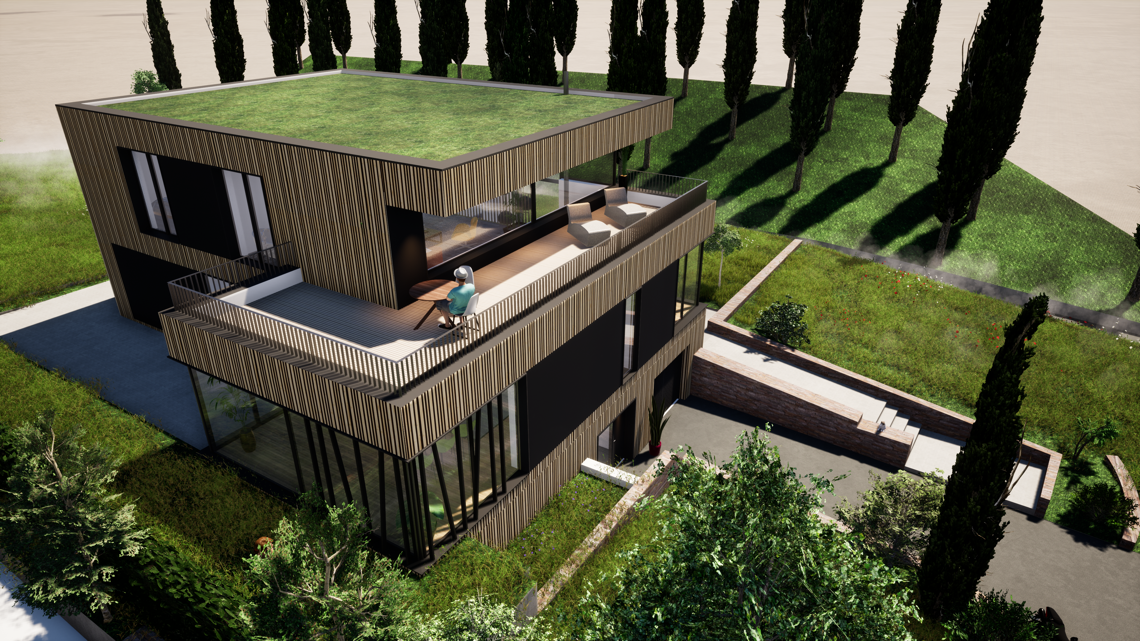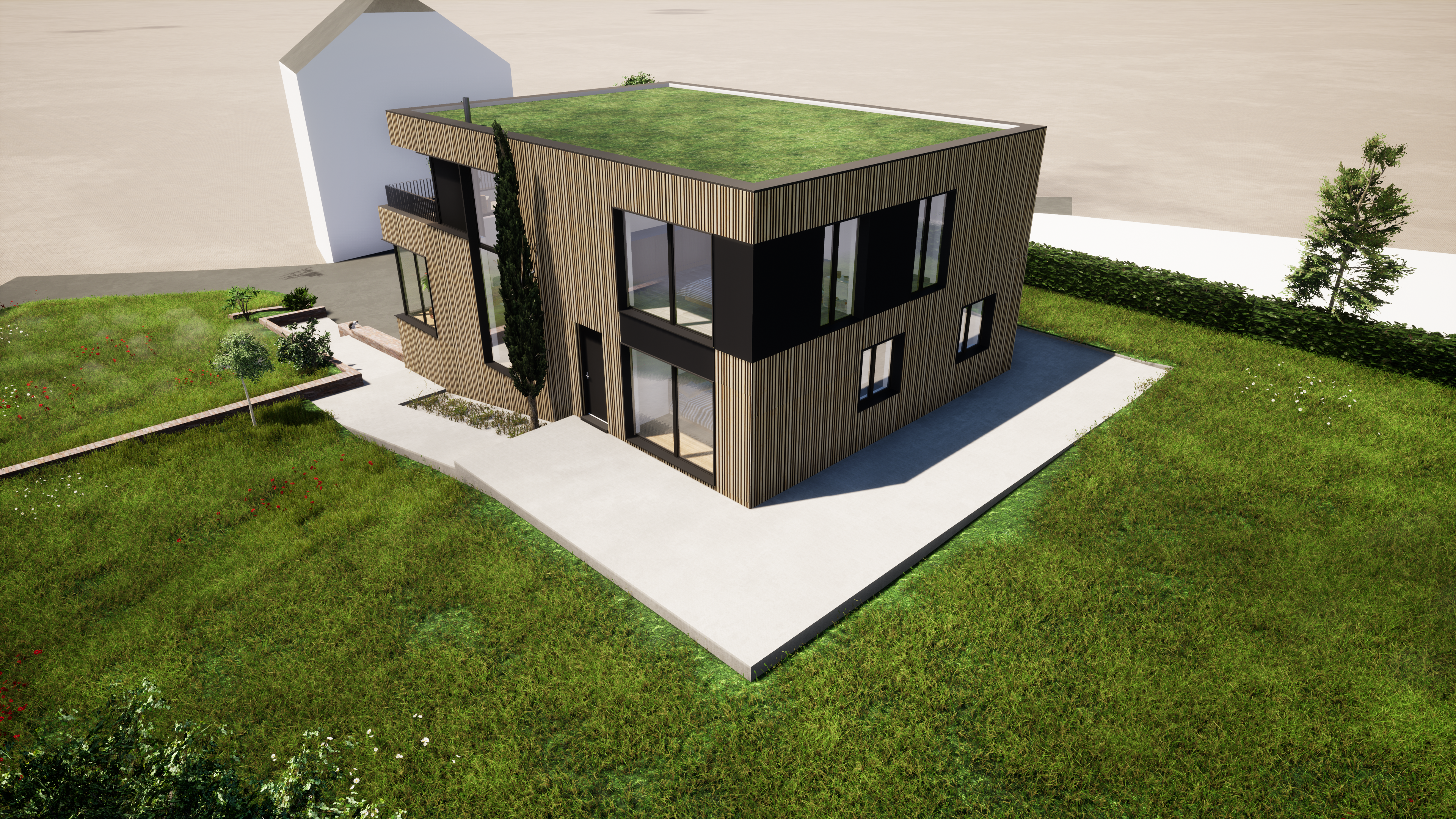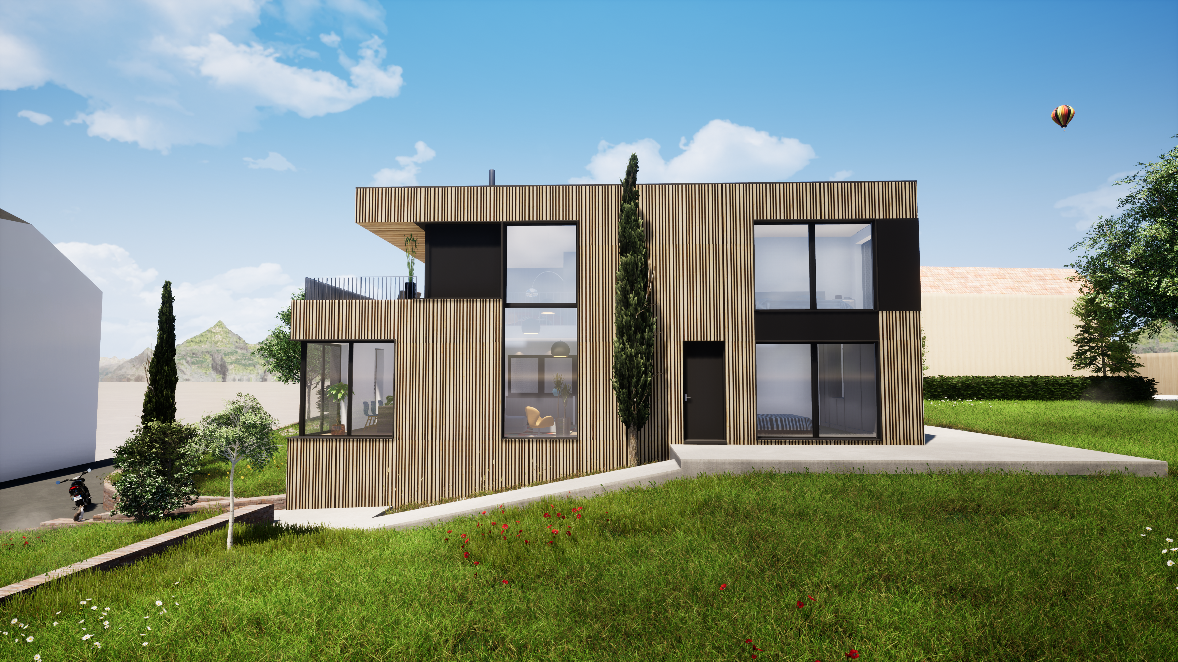 Matériaux utilisés : Bardage bois, panneaux composites, toiture végétalisées