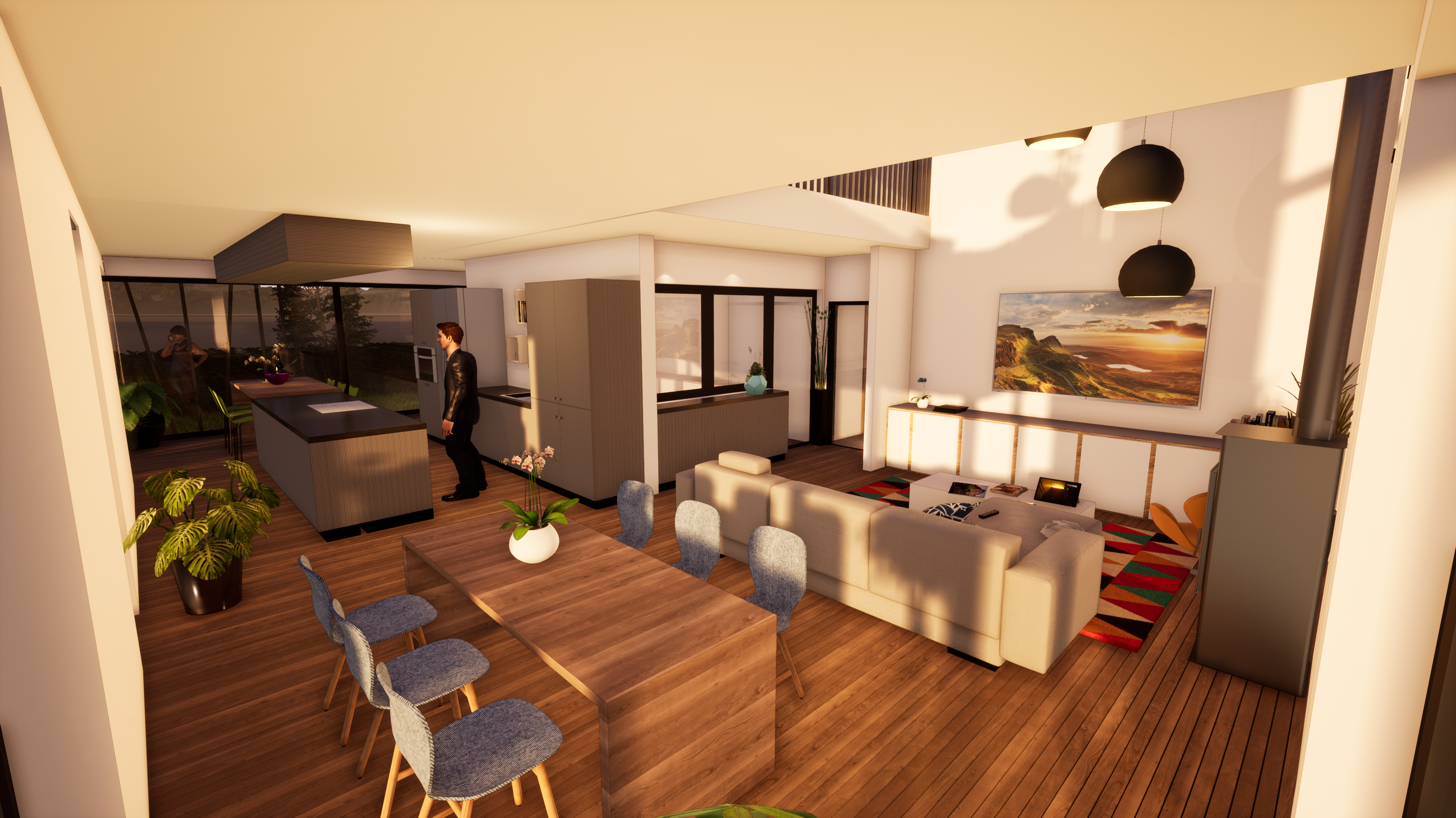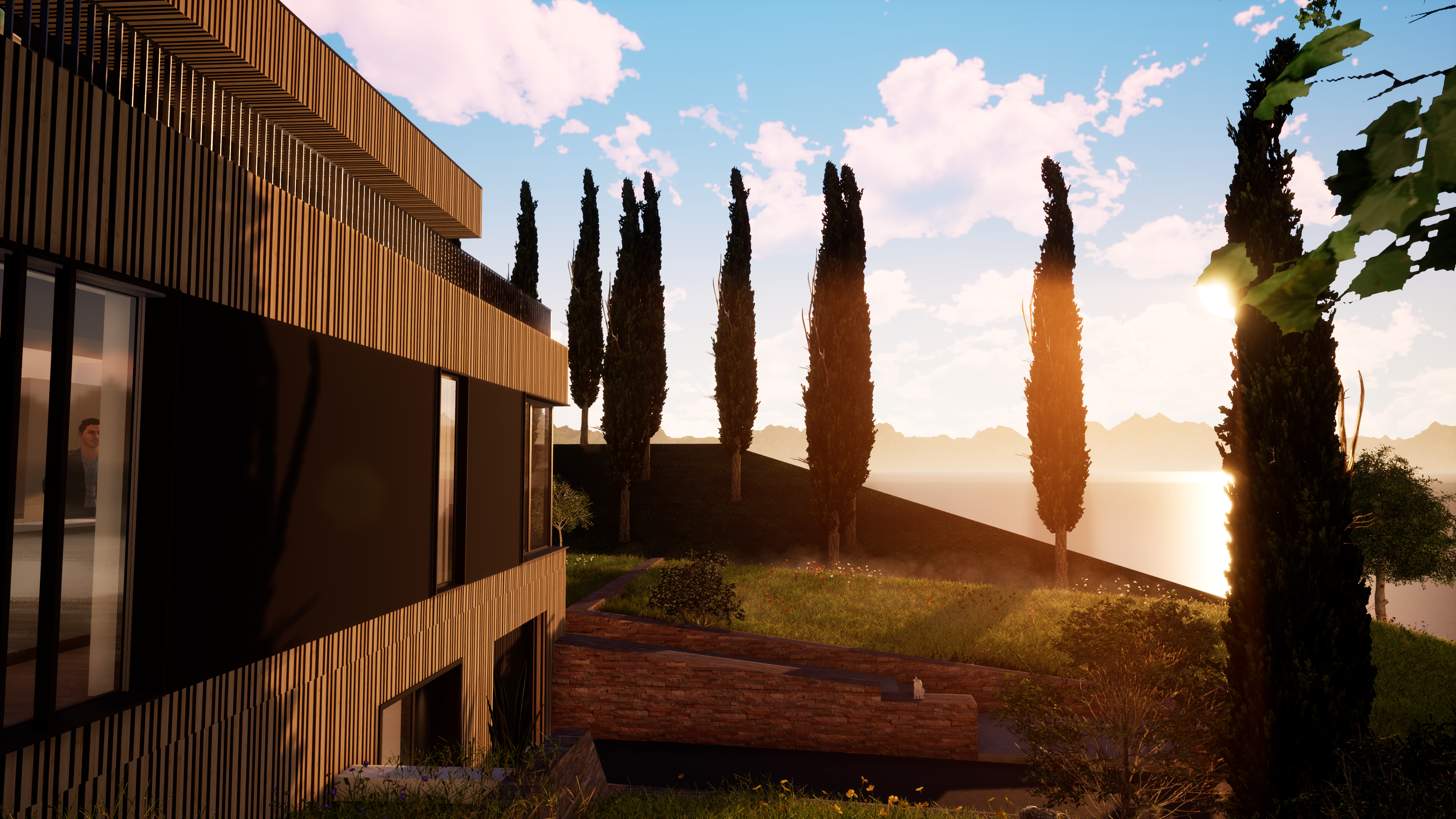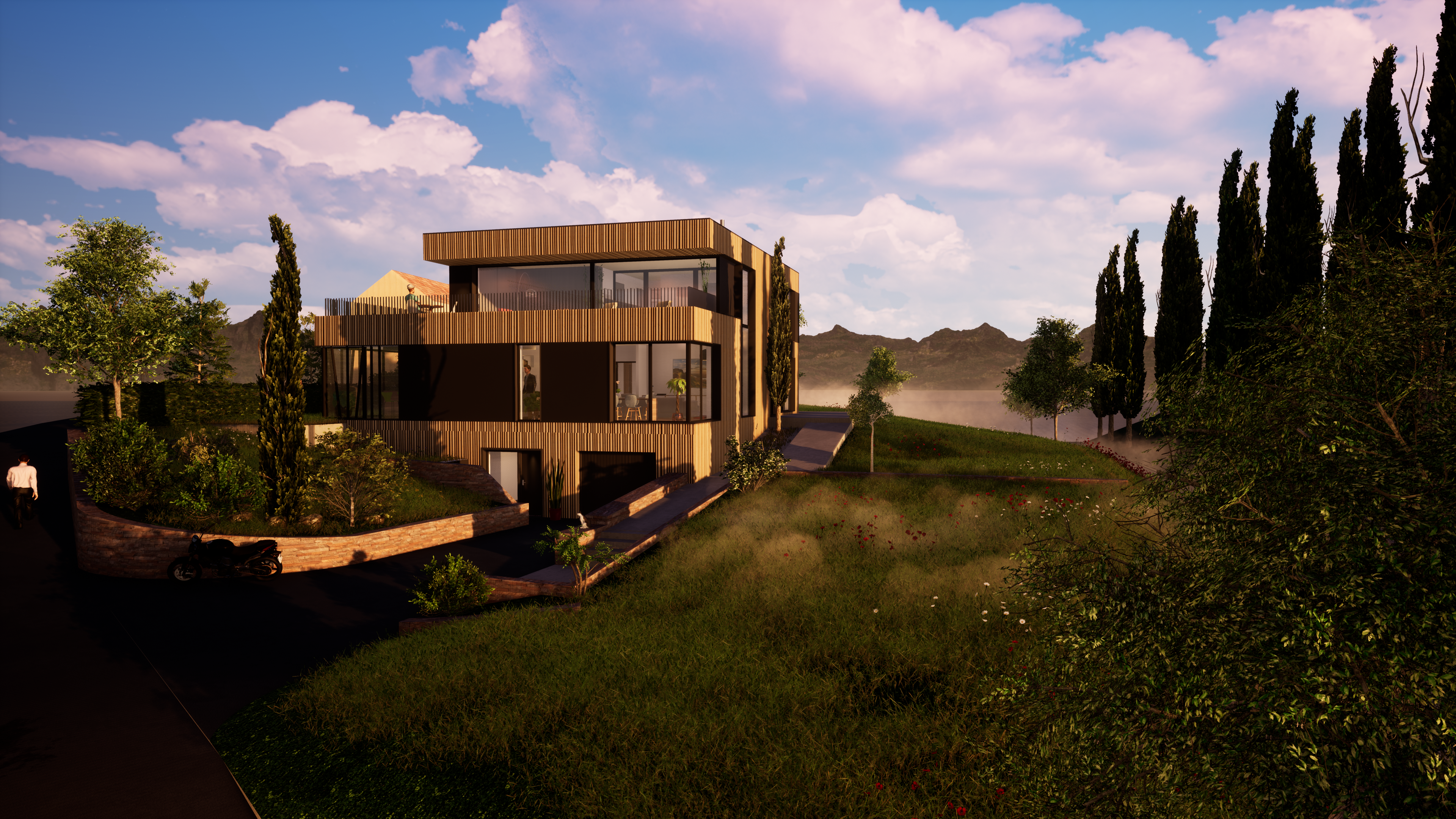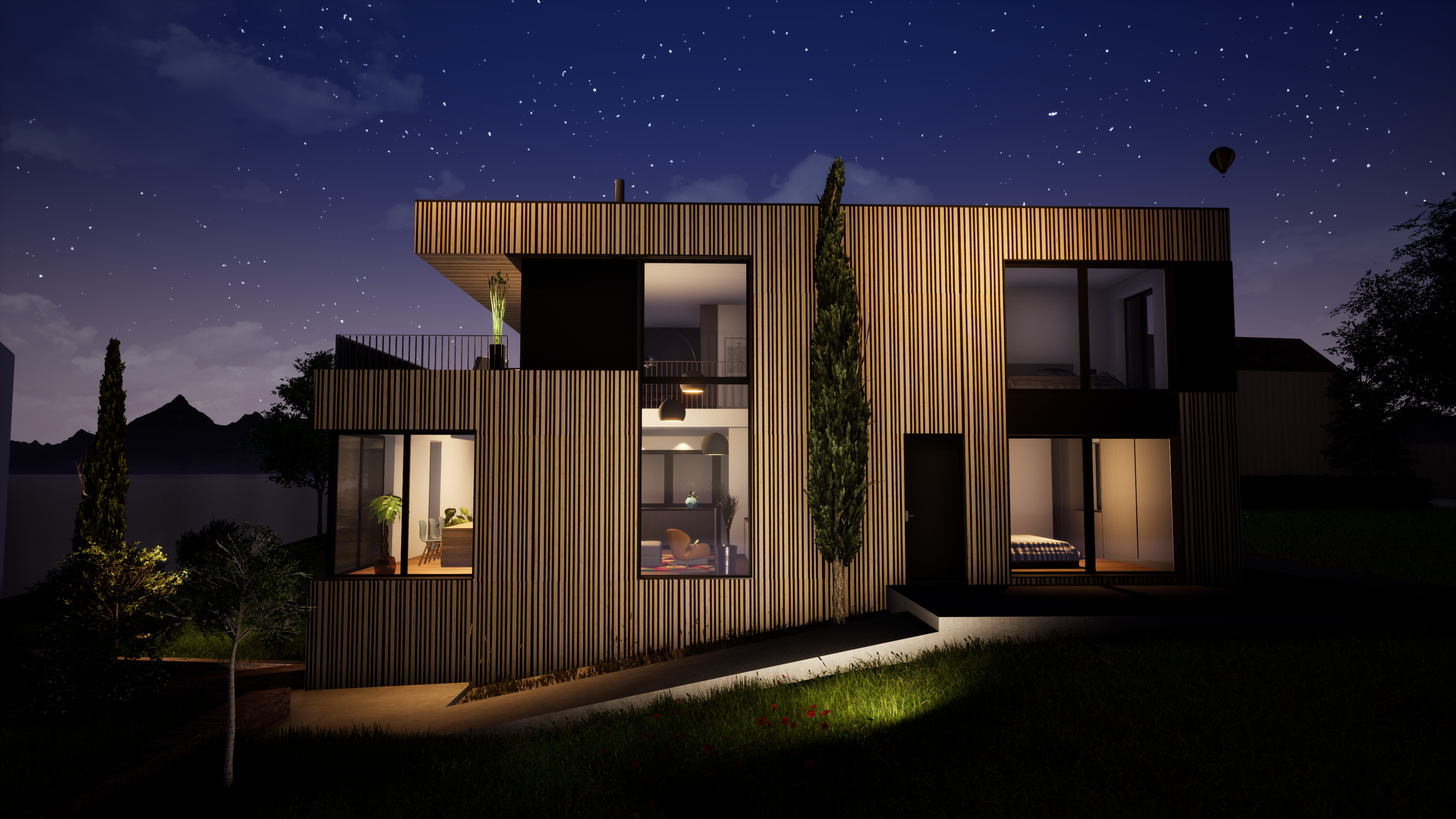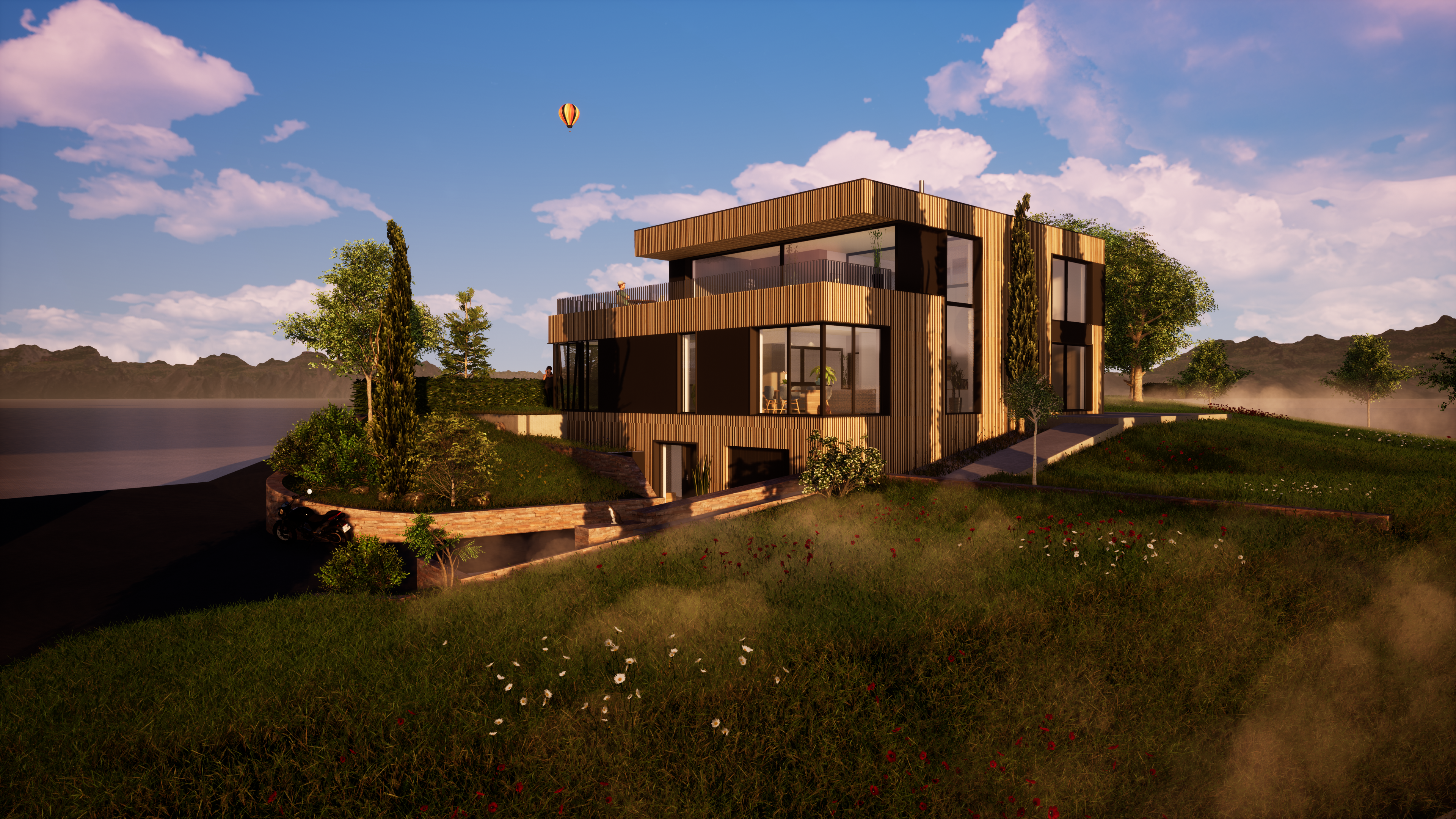 Matériaux utilisés : Bardage bois, panneaux composites, toiture végétalisées